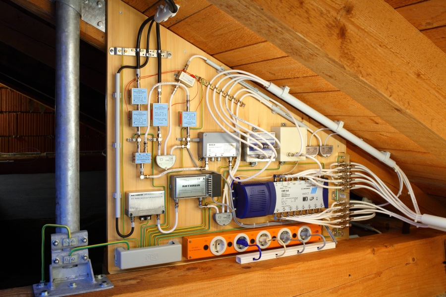 Somit konnte ich meine Planungen zum Aufbau dieser Salzburg-Vierergruppe in die Realität umsetzen. Ich passte die Kabellängen in dieser Weiche genau an den Kanal 32 an und baute meine bisherige Anlage komplett ab. Bei meiner vorigen Anlage war auch die Kathrein CAS 75 (rot) am Antennenmast montiert, diese ist jetzt an einem kleinen Mast an der Westseite unseres Hausdaches.