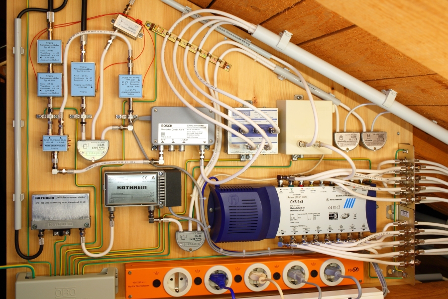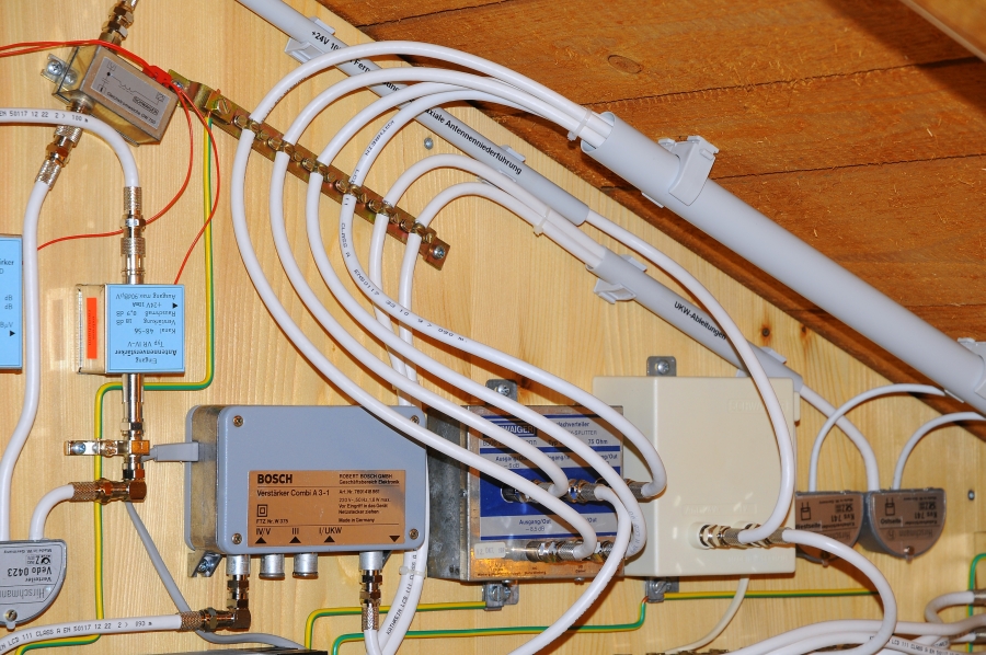 Dass Kathrein immer noch so einen schweren und stabilen Schiebemast in seiner Produktpalette gelistet hat, kam mir hier sehr entgegen. Denn die Windlast eines solchen Aufbaus ist schon enorm. Bei den Weichen zur Zusammenschaltung dagegen ist man ausschließlich auf gebrauchte Ware angewiesen, was aber nicht heißen soll, dass diese aufgrund ihres Alters in der Funktion beeinträchtigt sein könnten. Diese Kathrein-Weichen sind hochwertige Alu-Gußgehäuse und auch das „Innenleben“ besteht aus höchster Qualität. Aber so ein Teil zu ergattern ist leider äußerst selten.